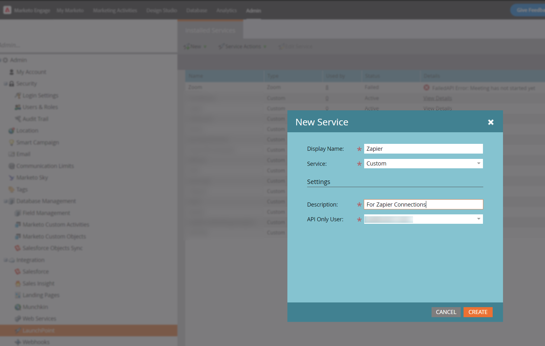 - Create a service via your created user (Admin -> Integration -> LaunchPoint)