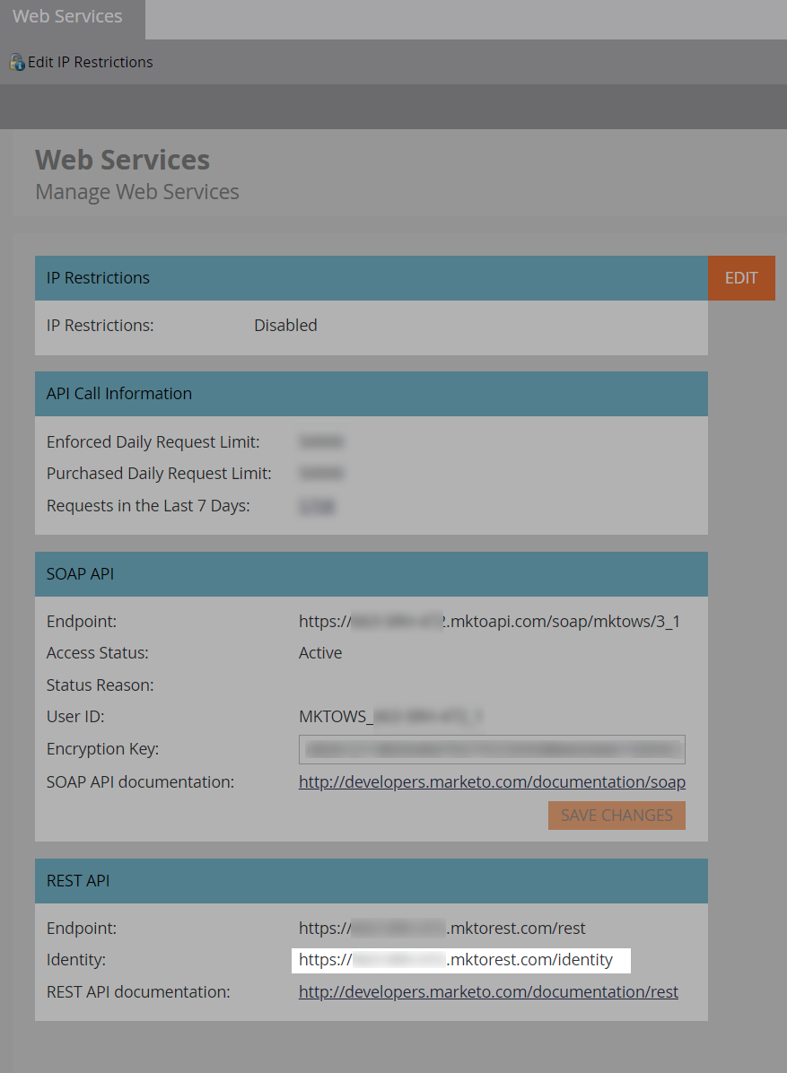 - From the web services tab, grab your REST API Identity endpoint URL (actually, just grab the URL without the /identity - we will need to use it both with '/identity' for authentication, and later with '/rest' for sending requests to Marketo)