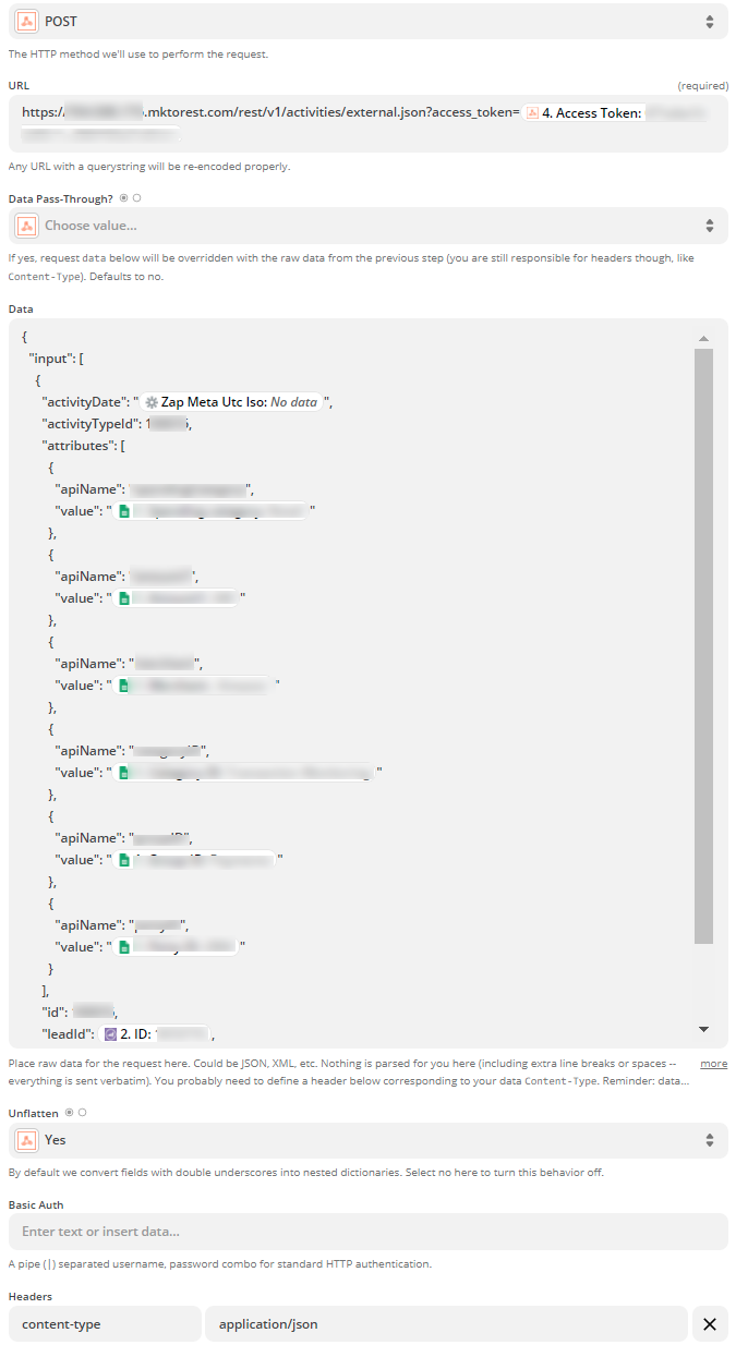 In the image below, I post a custom activity (already defined on Marketo side), with some data from a google spreadsheet I picked earlier. I use a Zapier Post webhook, aimed at the specific endpoint URL for posting activities: